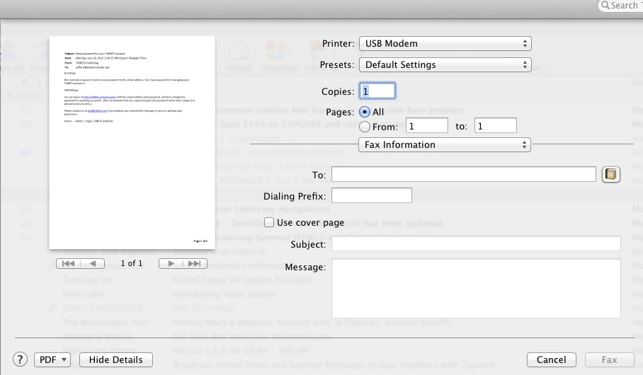 We were told that faxing would not be possible in 10.7.4, because PPC and 32bit is no longer supported, but I found an easy solution. I had purchased a ZOOM 56K V.92 USB #3095 External Modem (Windows, Mac, & Linux) while still using Snow Leopard. I needed to fax something today, and I read that perhaps USB modems will still work. It does. Here is the procedure. Go to File>Print and then choose Fax PDF from the dialog box: